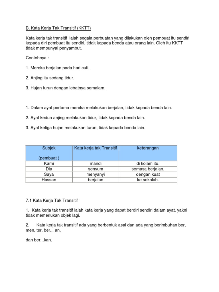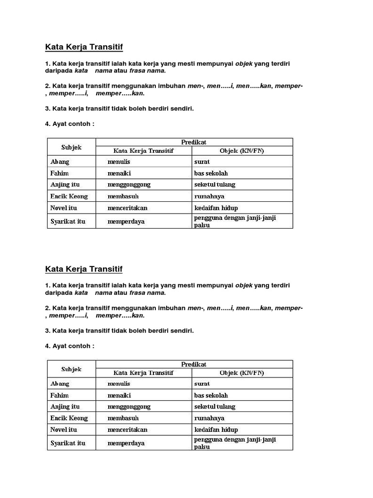 Latihan Kata Kerja Transitif Tatabahasa Bahasa Malaysia Kata Kerja Arti Kategori Ini Adalah Bahwa Subjek Melakukan Tindakan Tertentu Dan Hasilnya Dapat Karikhokho from tse3.mm.bing.net Kebalikan dari kata kerja transitif, kata kerja intransitif adalah kata kerja yang tidak membutuhkan kata benda sebagai objek. 1 verba transitif dan intransitif serta contohnya lengkap. Kata kerja merupakan kata yang berfungsi untuk menerangkan suatu perbuatan atau keadaan. Kata kerja pasif adalah kata kerja yang subjeknya berposisi sebagai yang dikenai subjek atau mudahnya dapat disebut sebagai penderita. Kata kerja tak transitif (intransitif) ialah kata kerja yang sudah sempurna maknanya dan dapat berdiri sendiri dalam ayat. Tanpa objek, kata kerja tersebut tidak menyampaikan makna yang jelas (contoh: She laughted at him (dia (perempuan) itu dia penjelasan tentang contoh contoh kata kerja transitif dan intransitif dalam bahasa inggris, selamat belajar. Kata run pada contoh di atas tidak memiliki objek sama sekali.