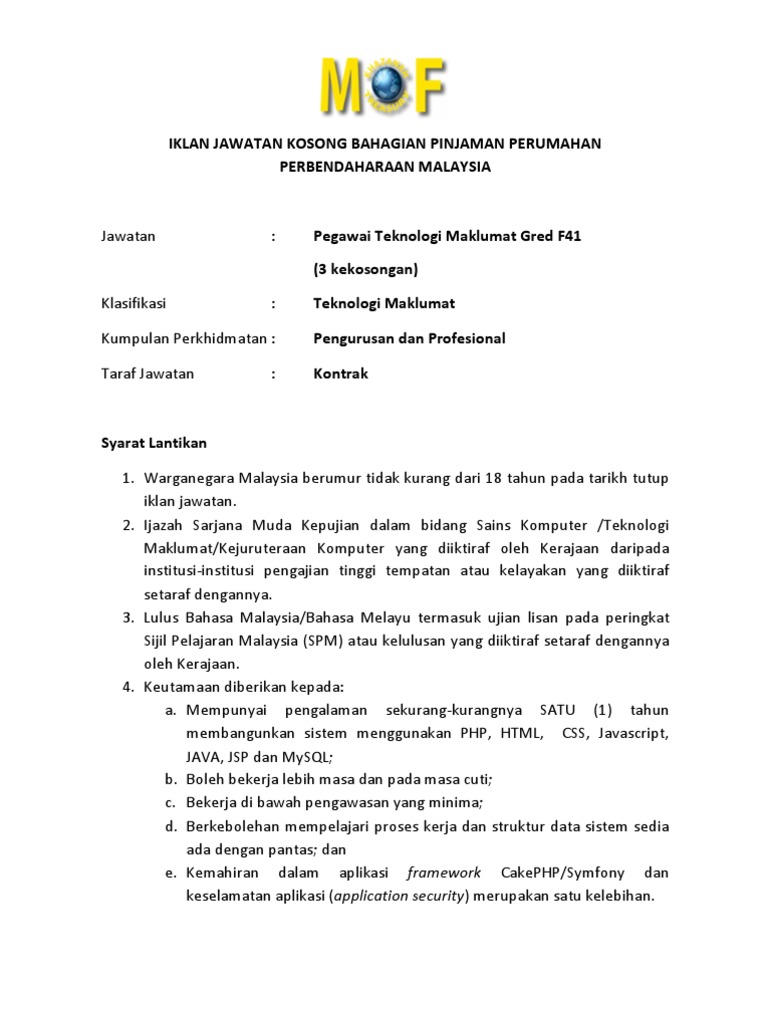 Iklan Jawatan Kosong Pegawai Teknologi Maklumat Sambilan F41 Ibu Pejabat Bahagian Keselamatan Dan Kualiti Makanan Kementerian Kesihatan Malaysia Kkm Permohonan Bahagian Keselamatan Dan Kualiti Makanan Kementerian Kesihatan Malaysia Facebook from lookaside.fbsbx.com Kementerian perdagangan antarabangsa dan industri (miti) mempelawa pemohon untuk mengisi jawatan kosong sebagai: Jawatan kosong terkini yang diiklankan adalah seperti berikut: Ijazah 3) pemohon diminta mengisi maklumat diri dengan lengkap dan pastikan muat naik resume anda yang terkini. Dato 'sri abdul wahid omar adalah presiden dan ketua pegawai eksekutif kumpulan maybank dari mei terima kasih kerana membaca maklumat mengenai jawatan kosong terkini diatas dari situs. Dapatkan kerja dan jawatan kosong kerajaan dan swasta seluruh negeri di malaysia yang menawarkan gaji tinggi dan lumayaan dan terbaik. Explore tweets of jawatan kosong @peluangkerjaya on twitter. Pegawai tadbir gred n41 3. Penolong pegawai teknologi maklumat gred fa29.