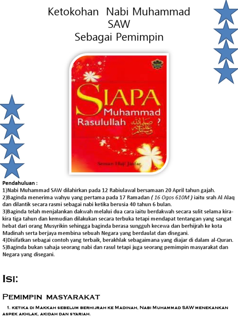 Diposkan pada 7 maret 20137 maret 2013 by abdullah. Kepimpinan nabi muhammad saw telah membawa masyarakat islam kepada kehidupan yang lebih. Setiap keturunan berasal dari ayahnya. Nabi muhammad saw/ rasulullah saw. Bentuk dan cara, bukan pada esensi spiritualitas sejarah dan penghadiran ulang ketokohan yang diupayakan lewat tradisi tersebut. Dari jubah, pedang, bahkan helai rambut janggut, dan patahan giginya pun menjadi barang peninggalan sejarah yang sekarang dimuseumkan. Please allow access to the microphone look at the top of your web browser. Rumah nabi muhammad saw di madinah terletak pada pojokan masjid nabawi. Ketokohan nabi muhammad saw sebagai pemimpin presented by : Sebagai seorang muslim, kita harus beriman pada nabi dan rasul allah swt, sebagaimana yang tertera dalam rukun iman keempat. Nabi muhammad saw bukan sahaja mempunyai ketokohan dari aspek kepimpinan baginda sebagai nabi dan rasul tetapi baginda juga sangat berkaliber dari aspek politik, social, ekonomi dan pertahanan. Sesudah nabi muhammad saw wafat ternyata banyak barang peninggalan beliau. Turunnya wahyu pertama alquran menandai dimulainya periode kenabian (nubuwwah).